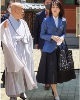 윤석열 당선인을 대신에 방문한 자리로 김여사는 구인사를 방문하면서 흰셔츠와 검정 치마, 검정가방, 검정 구두에 파란색 자켓을 입어 깔끔하면서 너무 어둡지 않은 의상을 착용했는데 그중에서도 무난한 검은색 치마가 사람들의 관심을 끌었습니다.